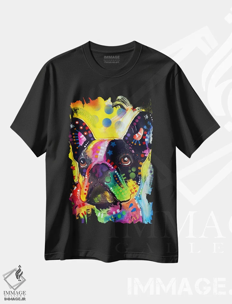 تیشرت طرح دار پرترهٔ سگ، بولداگ فرانسوی، هنر فاخر معاصر اثر الکس مووچون | فروشگاه ایماژ