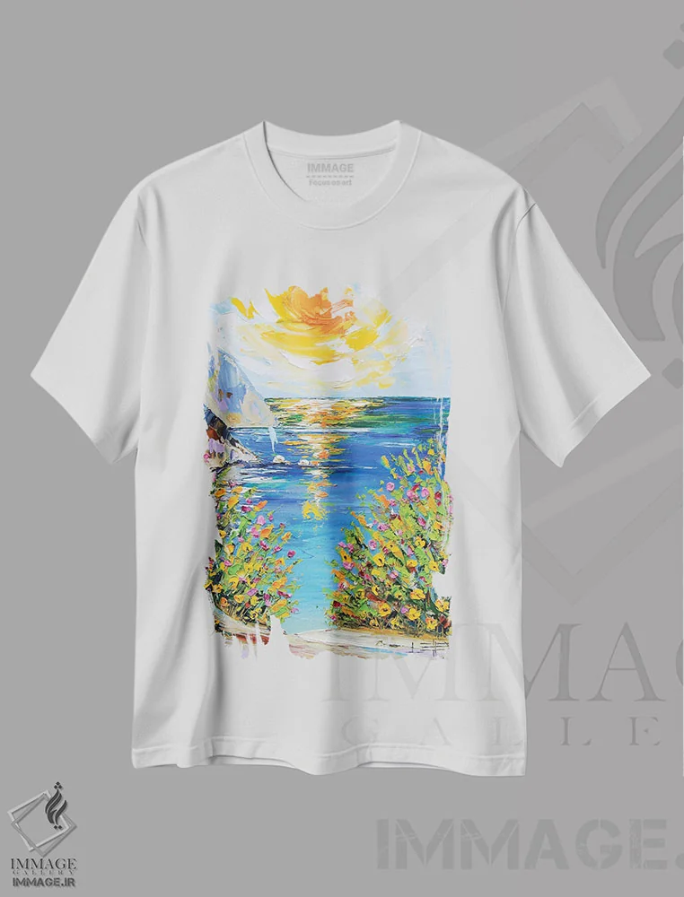 تیشرت سفید طرح دار سعادت در ساحل، هنر فاخر معاصر اثر لیزا الی | فروشگاه ایماژ