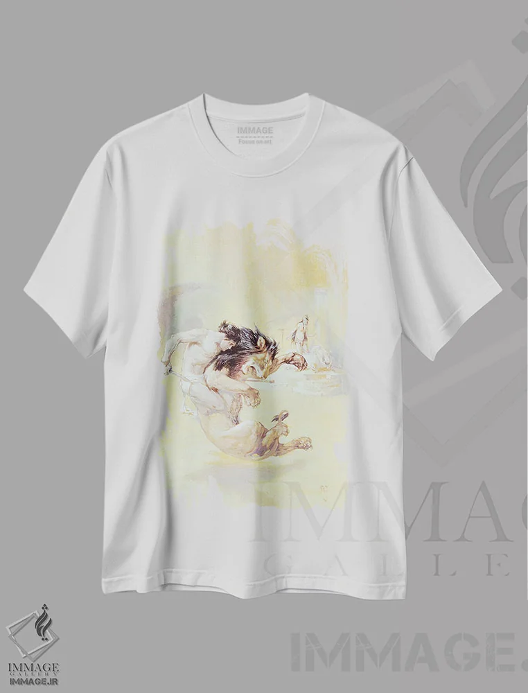 تیشرت سفید طرح دار تارزان و شیر طلایی، هنر دیجیتال اثر جو جوسکو | فروشگاه ایماژ تیشرت طرح دار تارزان و شیر طلایی اثر جو جوسکو