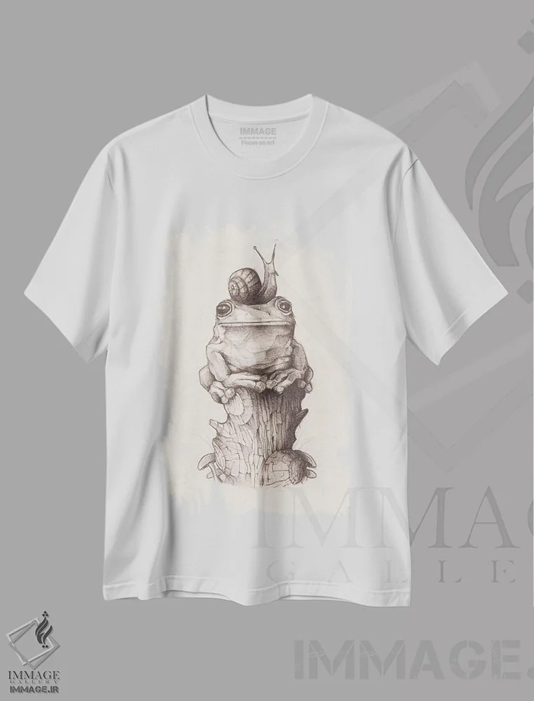 تیشرت سفید طرح دار – تیشرت هنری سیاه وسفید ,"قورباغه و حلزون " اثر مایک کوبو فروشگاه ایماژ تیشرت طرح هنری سیاه وسفید ,"قورباغه و حلزون " اثر مایک کوبو