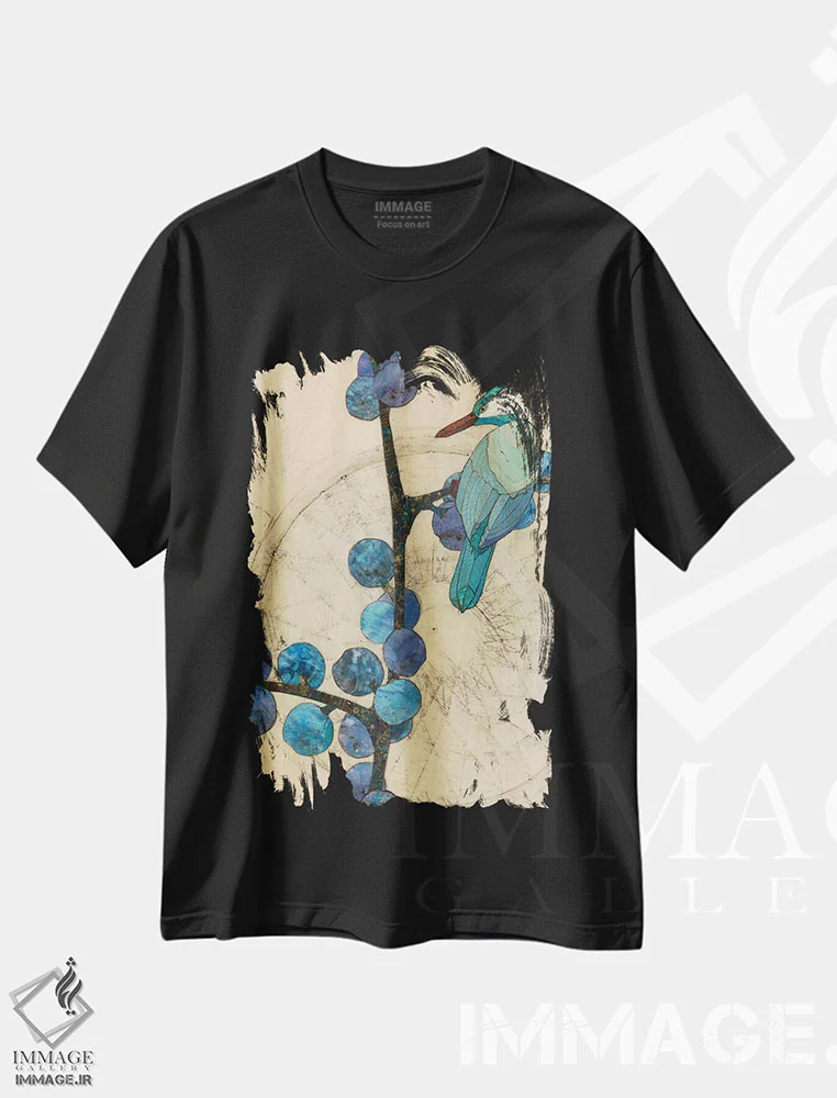 تیشرت مشکی طرح دار پرنده زمستانی، دکور معاصر اثر کارن سیکیه | فروشگاه ایماژ