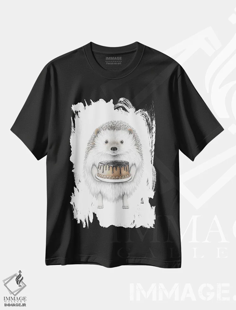 تیشرت مشکی طرح دار – تیشرت حیوانات ,جوجه تیغی با کیک اثر مندی هک فروشگاه ایماژ تیشرت طرح حیوانات ,جوجه تیغی با کیک اثر مندی هک