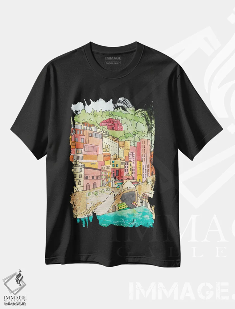 تیشرت مشکی طرح دار روستا کنار رودخانه، دکور معاصر اثر جن بوچلی | فروشگاه ایماژ