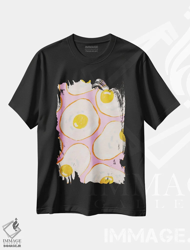 تیشرت مشکی طرح دار تخم مرغ نیمرو صورتی، هنر فاخر معاصر اثر کارتیکا پارامیتا | فروشگاه ایماژ