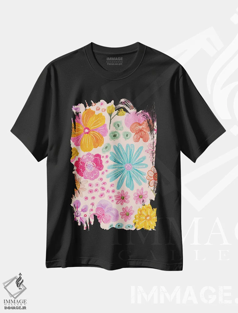 تیشرت مشکی طرح دار – تیشرت رنگارنگ ,"شکوفه های رنگارنگ خاک رس" اثر استودیو هنری میهو فروشگاه ایماژ