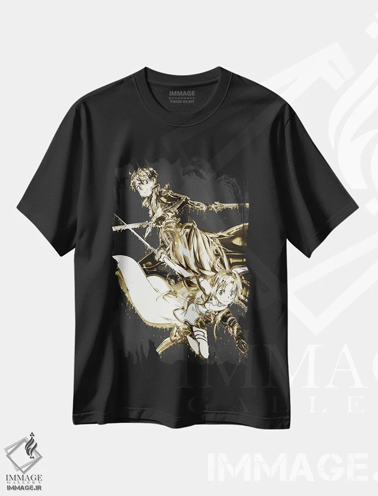 تیشرت مشکی طرح دار کیریتو و آسونا طلایی، تزئینی اثر گب فرناندو | فروشگاه ایماژ