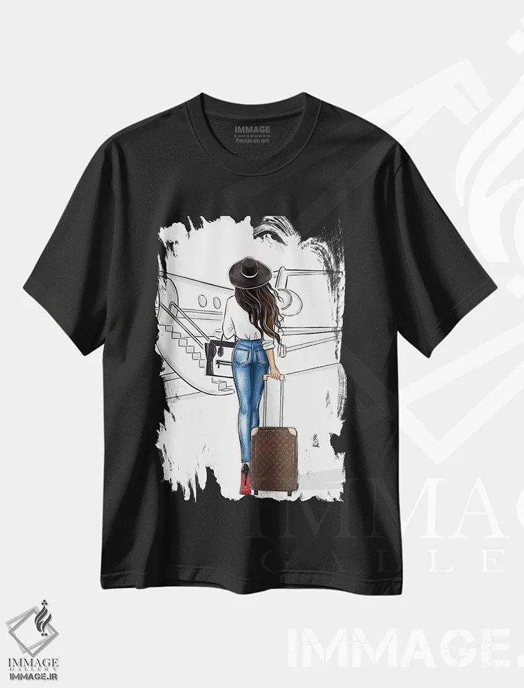 تیشرت مشکی طرح دار سفر با هواپیما؛ دختر مشکی مو، تزئینی اثر لالانا آرتس | فروشگاه ایماژ تیشرت طرح دار سفر با هواپیما؛ دختر مشکی مو اثر لالانا آرتس