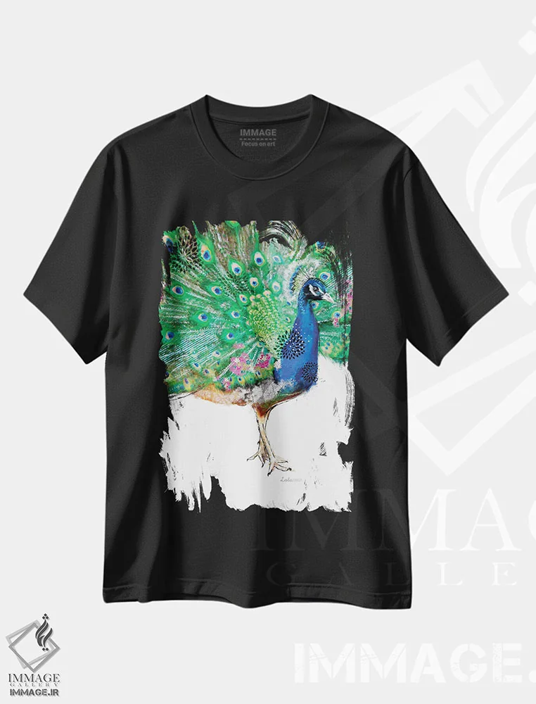 تیشرت مشکی طرح دار – تیشرت هنری ,"شکوه طاووس" اثر شارلین لومیس فروشگاه ایماژ