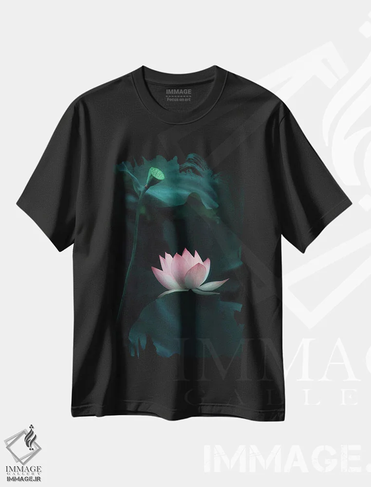 تیشرت مشکی طرح دار – تیشرت گلدار هنری ,گل نیلوفر آبی اثر مارین لوپ فروشگاه ایماژ