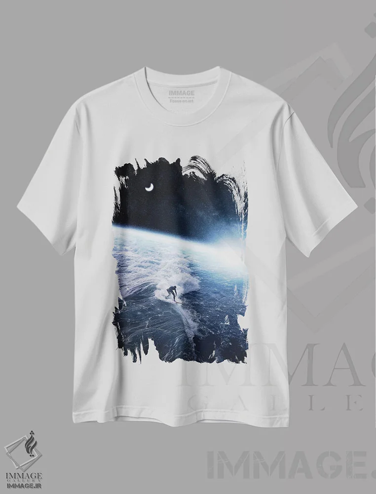 تیشرت سفید طرح دار موج سواری روی سیاره زمین، فضا و هلال ماه، عکاسی ترکیبی اثر جن زد | فروشگاه ایماژ