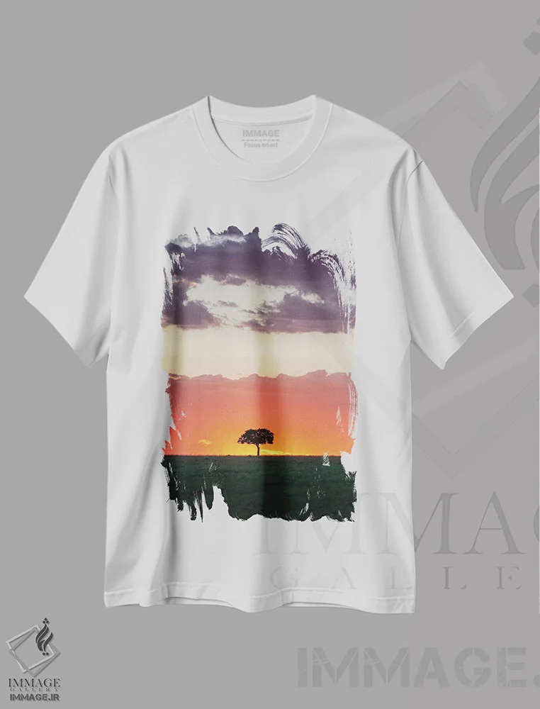 تیشرت سفید طرح دار درخت آکاسیا در غروب، ماسایی مارا، مدیوم اثر جین ریکس | فروشگاه ایماژ تیشرت طرح دار درخت آکاسیا در غروب، ماسایی مارا اثر جین ریکس