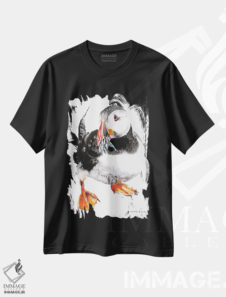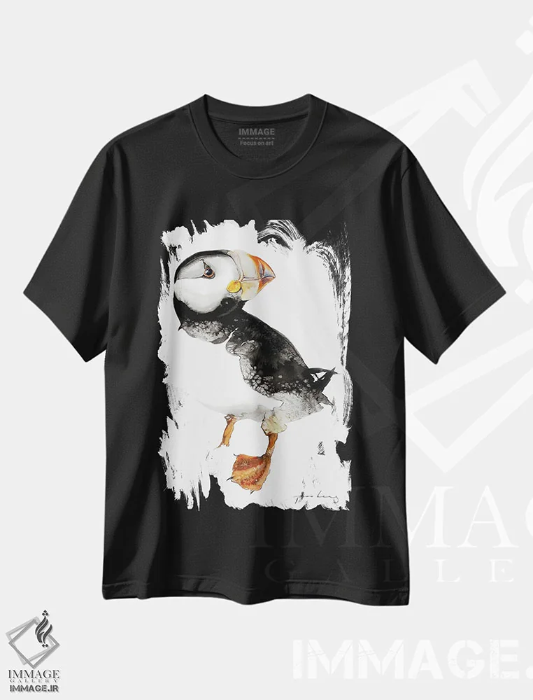 تیشرت مشکی طرح دار "پافین"، هنر فاخر معاصر اثر لیزا لنون | فروشگاه ایماژ