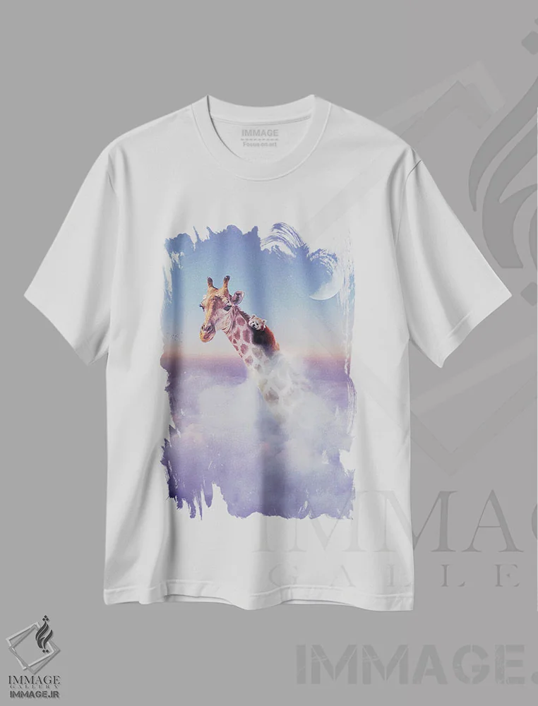 تیشرت سفید طرح دار زرافه و پاندای سرخ در میان ابرها، عکاسی ترکیبی اثر جن زد | فروشگاه ایماژ