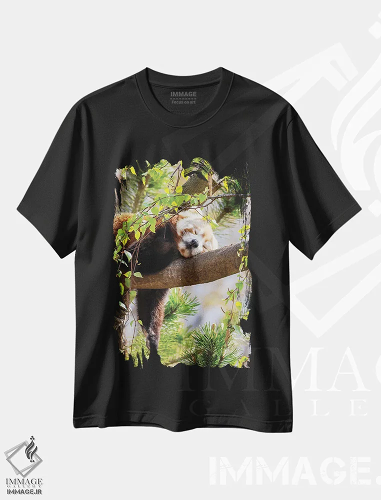 تیشرت مشکی طرح دار پاندای قرمز خوابیده روی درخت، عکاسی ماکرو اثر جین ریکس | فروشگاه ایماژ