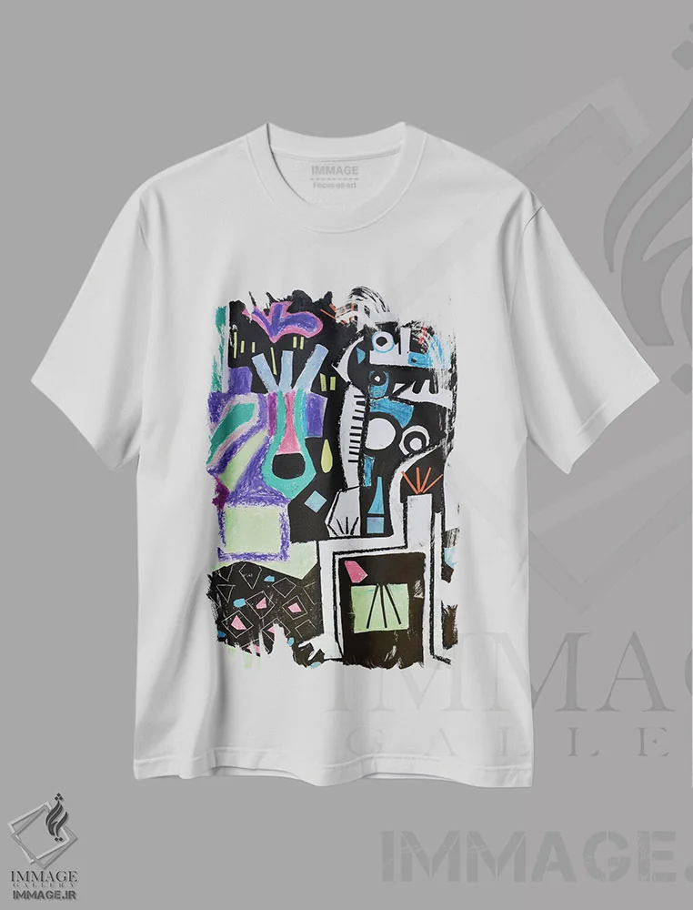 تیشرت سفید طرح دار شخصیت و منظره رنگارنگ، آبستره اثر جن دو | فروشگاه ایماژ