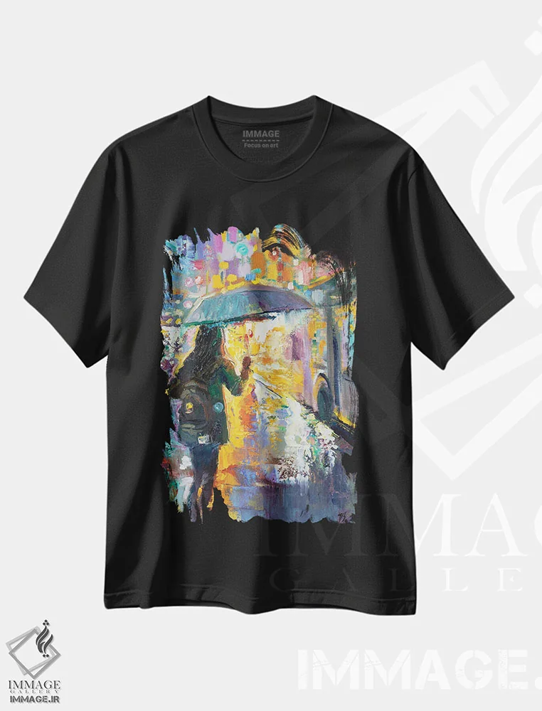 تیشرت مشکی طرح دار بگذار باران ببارد، هنر فاخر معاصر اثر کوپتسووا آرت | فروشگاه ایماژ تیشرت طرح دار بگذار باران ببارد اثر کوپتسووا آرت