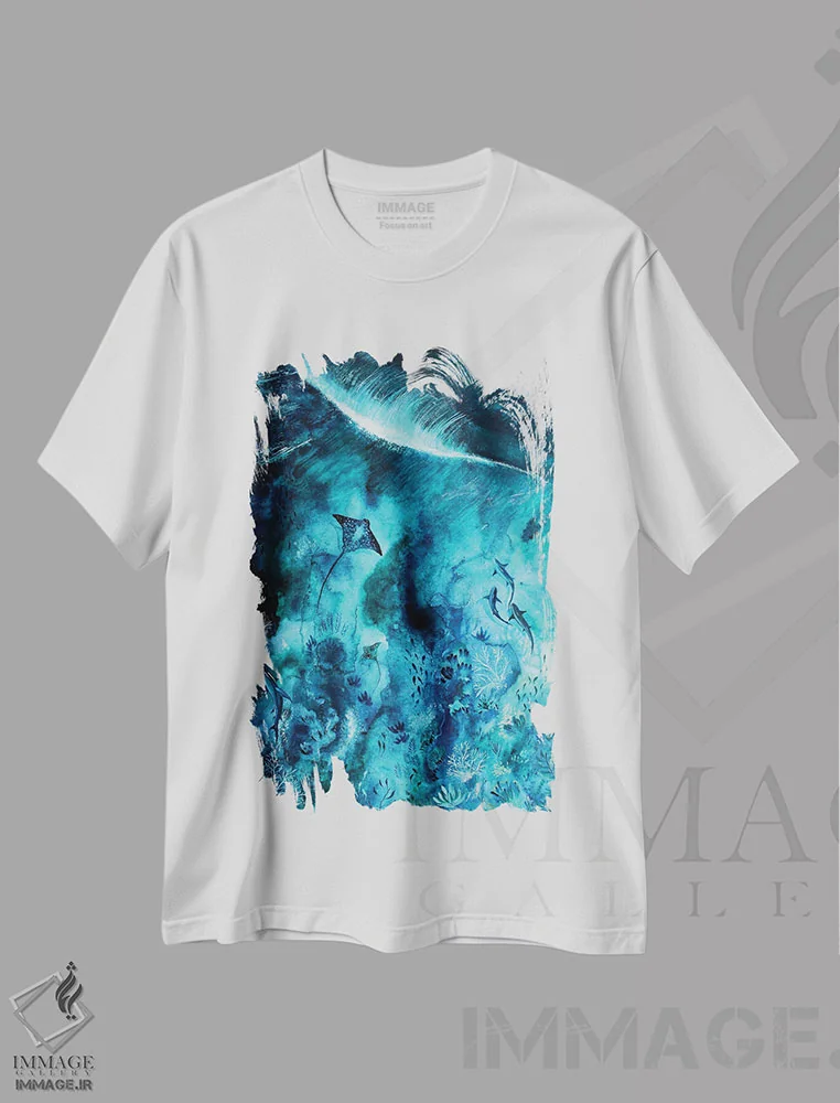 تیشرت سفید طرح دار تاخت وتاز زیر آب، دکور ساحلی اثر الا مازور | فروشگاه ایماژ تیشرت طرح دار تاخت وتاز زیر آب اثر الا مازور