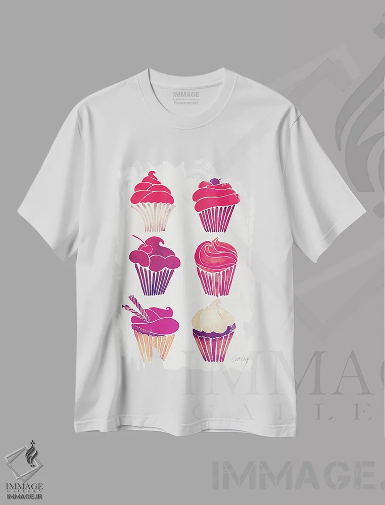 تیشرت سفید طرح دار کاپ کیک های ارغوانی، تزئینی اثر کت کوکیلت | فروشگاه ایماژ تیشرت طرح دار کاپ کیک های ارغوانی اثر کت کوکیلت