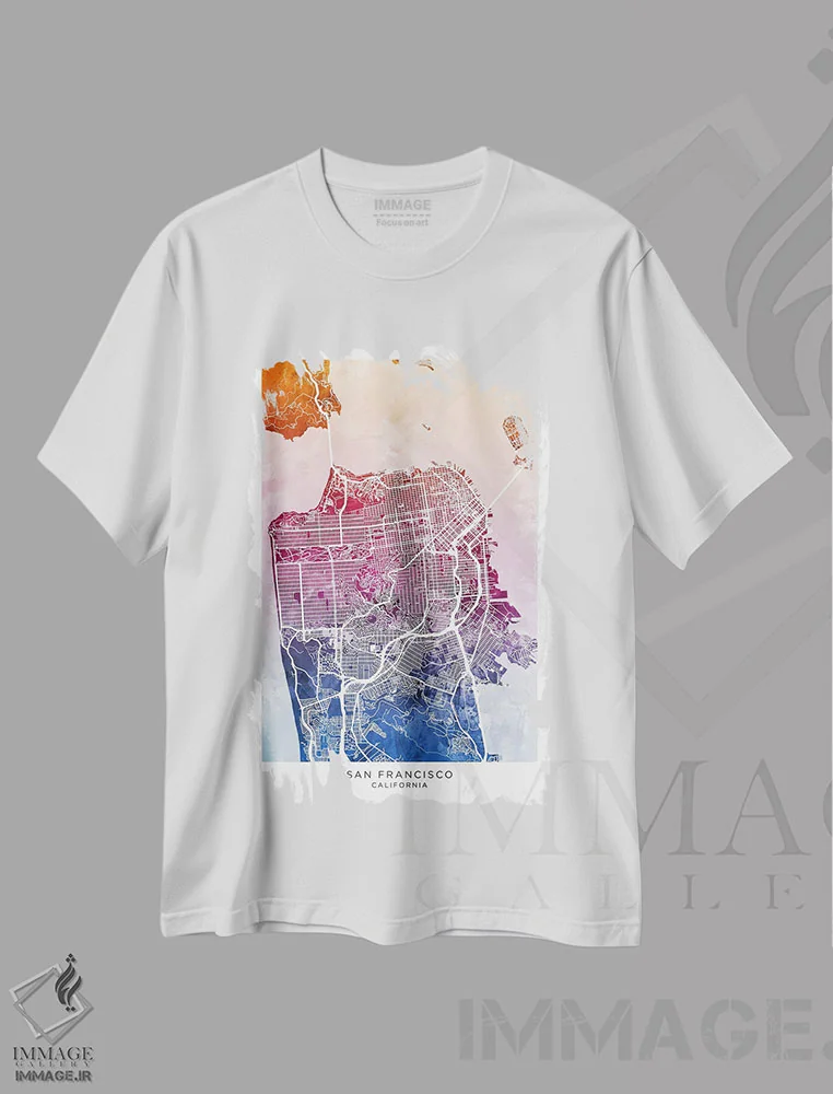 تیشرت سفید طرح دار – تیشرت دیجیتال آرت ,نقشه سان فرانسیسکو آبی-صورتی اثر مایکل تامپست فروشگاه ایماژ تیشرت طرح دیجیتال آرت ,نقشه سان فرانسیسکو آبی-صورتی اثر مایکل تامپست