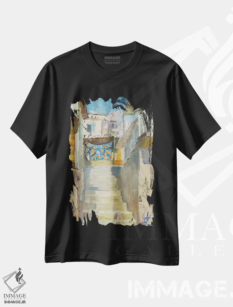 تیشرت مشکی طرح دار گم شده در رنگ های عصر، تزئینی اثر اف ان کی دیزاینز | فروشگاه ایماژ تیشرت طرح دار گم شده در رنگ های عصر اثر اف ان کی دیزاینز