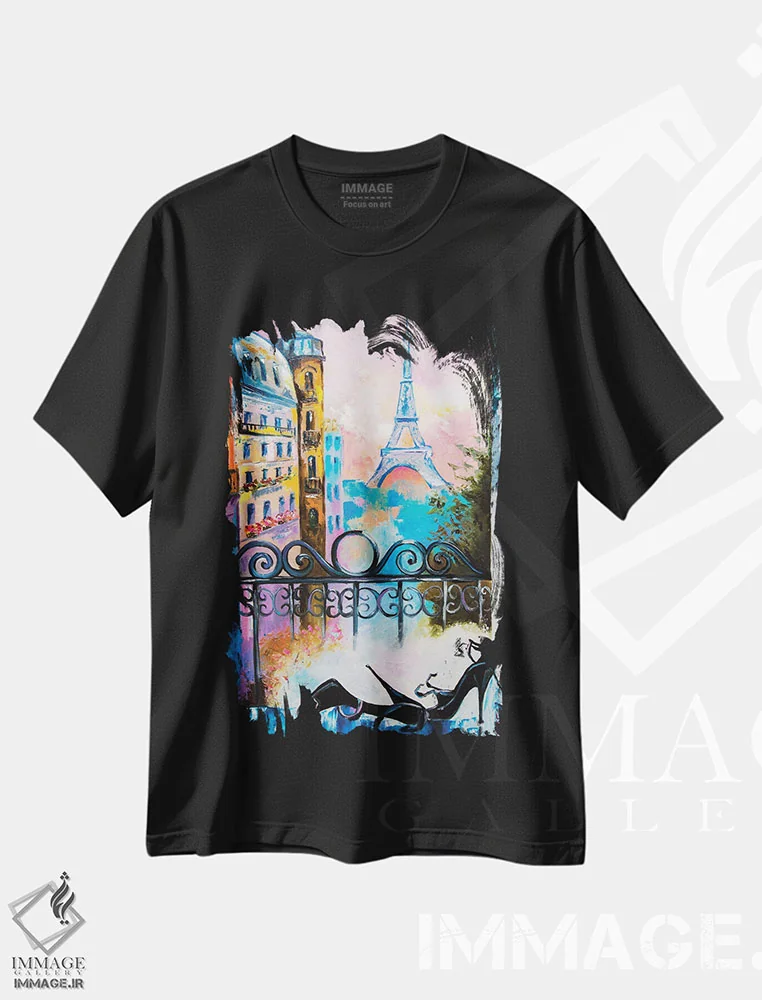 تیشرت مشکی طرح دار قرار عاشقانه در پاریس، دکور معاصر اثر کوپتسووا آرت | فروشگاه ایماژ تیشرت طرح دار قرار عاشقانه در پاریس اثر کوپتسووا آرت