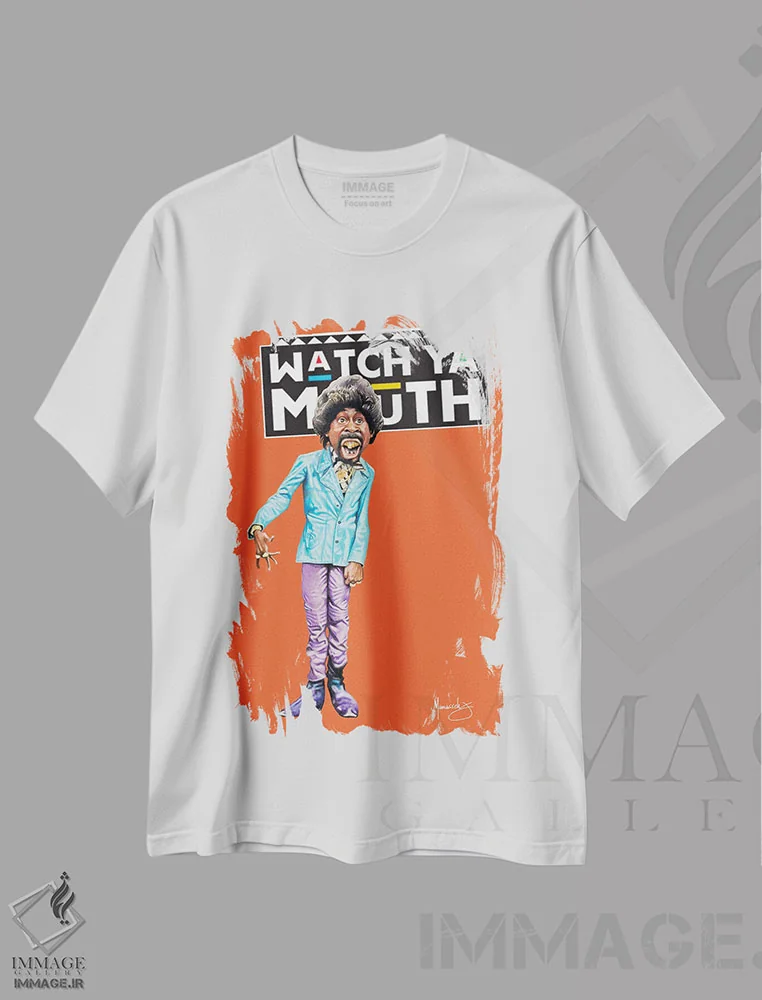 تیشرت سفید طرح دار – تیشرت گرافیکی ,"دهانت را کنترل کن" اثر ماناسه جانسون فروشگاه ایماژ تیشرت طرح گرافیکی ,"دهانت را کنترل کن" اثر ماناسه جانسون