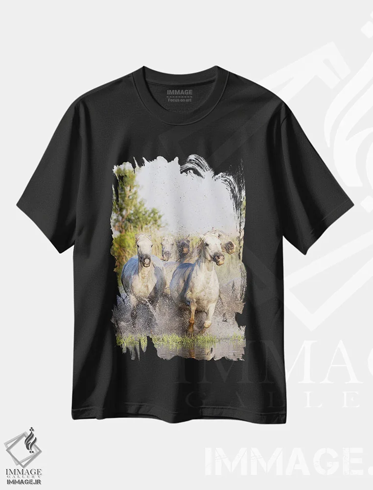 تیشرت مشکی طرح دار اسب های چهارنعل، دکور روستایی اثر گرگ جوردانو | فروشگاه ایماژ تیشرت طرح دار اسب های چهارنعل اثر گرگ جوردانو