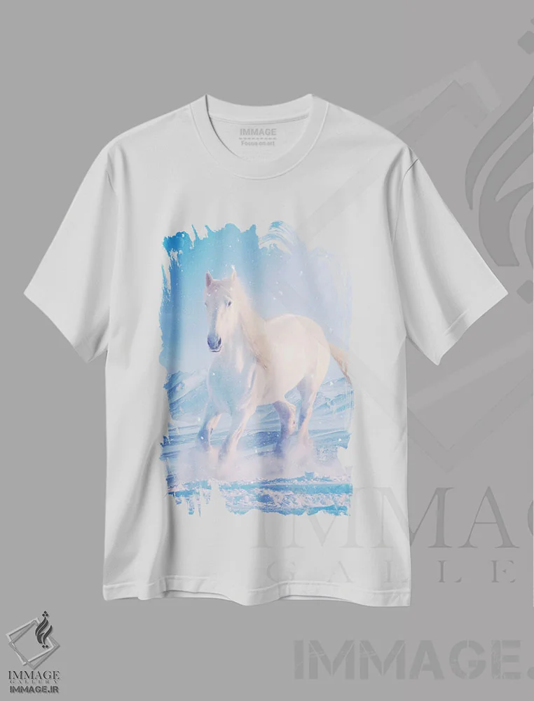 تیشرت سفید طرح دار اسب سفید در برف، هنر دیجیتال اثر جن زد | فروشگاه ایماژ تیشرت طرح دار اسب سفید در برف اثر جن زد