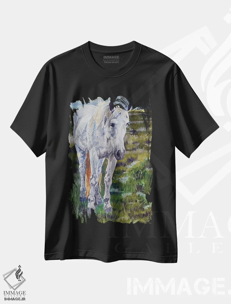 تیشرت مشکی طرح دار یک اسب سفید آسمانی، دکوراسیون جایگزین اثر فافا کورولوا | فروشگاه ایماژ تیشرت طرح دار یک اسب سفید آسمانی اثر فافا کورولوا