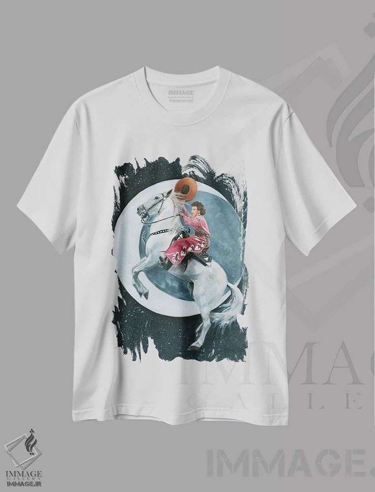تیشرت سفید طرح دار ماه اسب چموش، هنر فاخر معاصر اثر لیزا باترز | فروشگاه ایماژ تیشرت طرح دار ماه اسب چموش اثر لیزا باترز