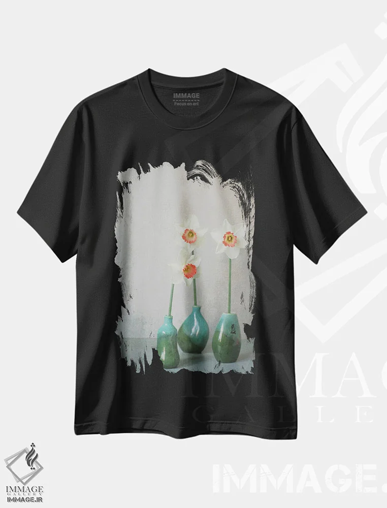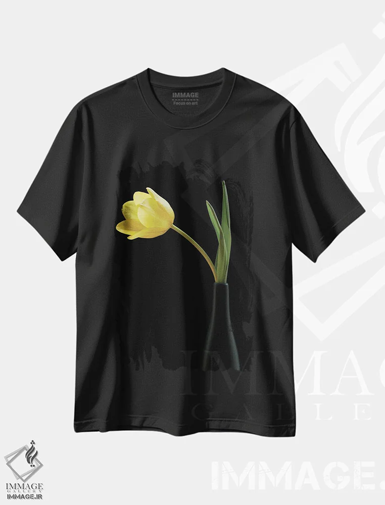 تیشرت مشکی طرح دار لالهٔ زرد در گلدان سیاه، عکاسی ماکرو اثر آلیسون فنل | فروشگاه ایماژ