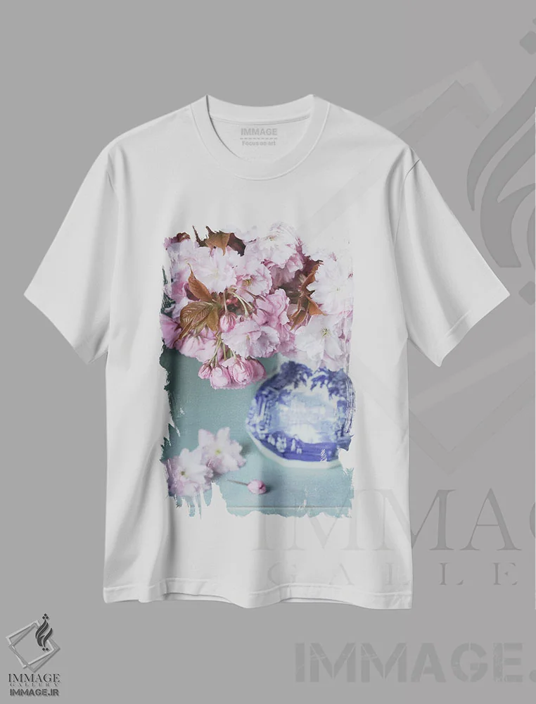تیشرت سفید طرح دار طبیعت بی جان شکوفه گیلاس، مدیوم اثر آلیسون فنل | فروشگاه ایماژ
