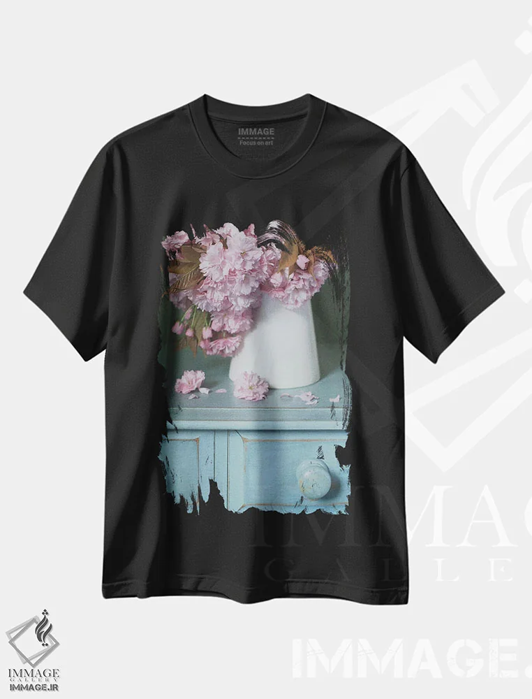 تیشرت مشکی طرح دار شکوفه گیلاس در پارچ سفید، مدیوم اثر آلیسون فنل | فروشگاه ایماژ