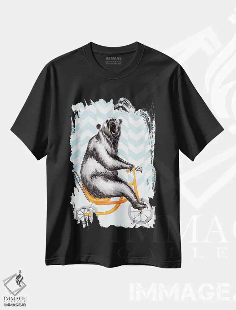 تیشرت مشکی طرح دار خرس روی دوچرخه، تزئینی اثر آملی لگو | فروشگاه ایماژ تیشرت طرح دار خرس روی دوچرخه اثر آملی لگو