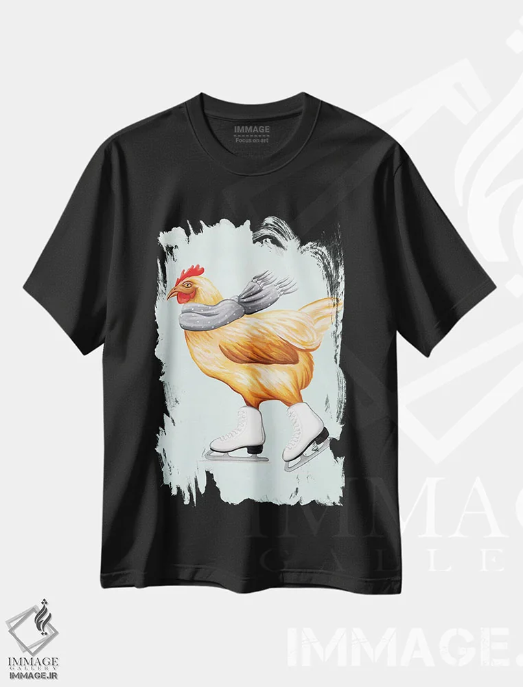 تیشرت مشکی طرح دار مرغ با اسکیت روی یخ، تزئینی اثر آملی لگو | فروشگاه ایماژ تیشرت طرح دار مرغ با اسکیت روی یخ اثر آملی لگو