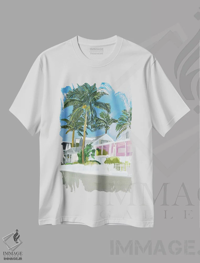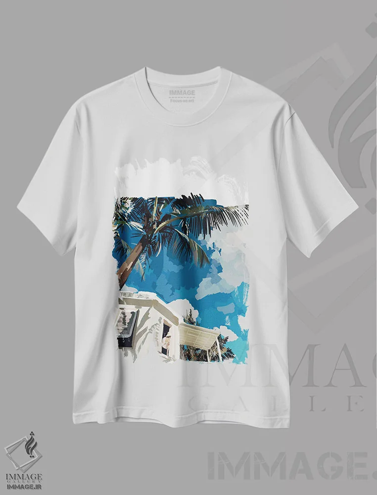 تیشرت سفید طرح دار چشم انداز نخل ها، تزئینی اثر آملیا نویز | فروشگاه ایماژ تیشرت طرح دار چشم انداز نخل ها اثر آملیا نویز