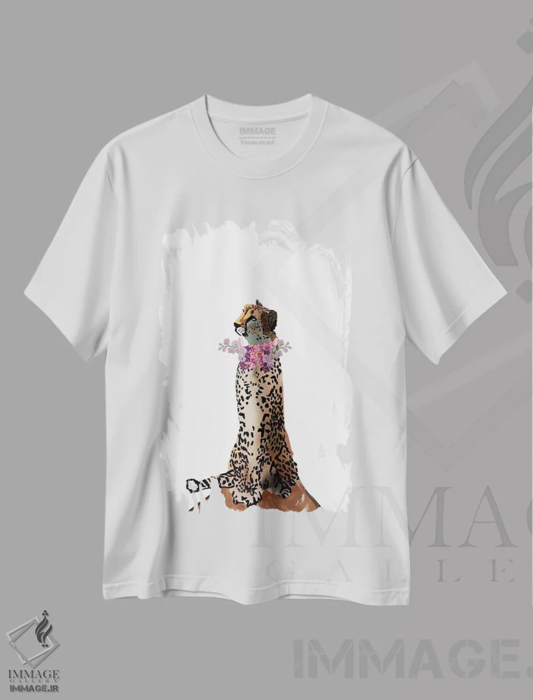 تیشرت سفید طرح دار گل های یوزپلنگ، تزئینی اثر آملیا نویز | فروشگاه ایماژ تیشرت طرح دار گل های یوزپلنگ اثر آملیا نویز