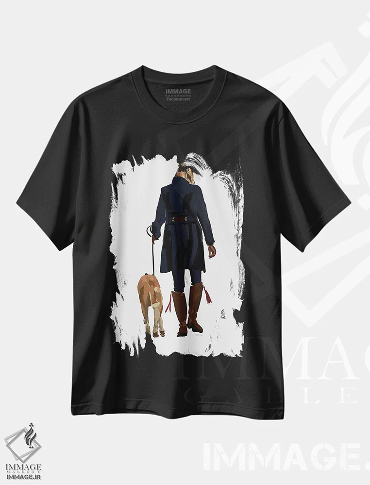 تیشرت مشکی طرح دار دختر در حال پیاده روی با سگ، تزئینی اثر آملیا نویز | فروشگاه ایماژ تیشرت طرح دار دختر در حال پیاده روی با سگ اثر آملیا نویز