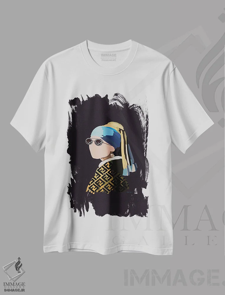 تیشرت سفید طرح دار دختر با گوشواره مرواریدی فندی، تزئینی اثر آملیا نویز | فروشگاه ایماژ تیشرت طرح دار دختر با گوشواره مرواریدی فندی اثر آملیا نویز