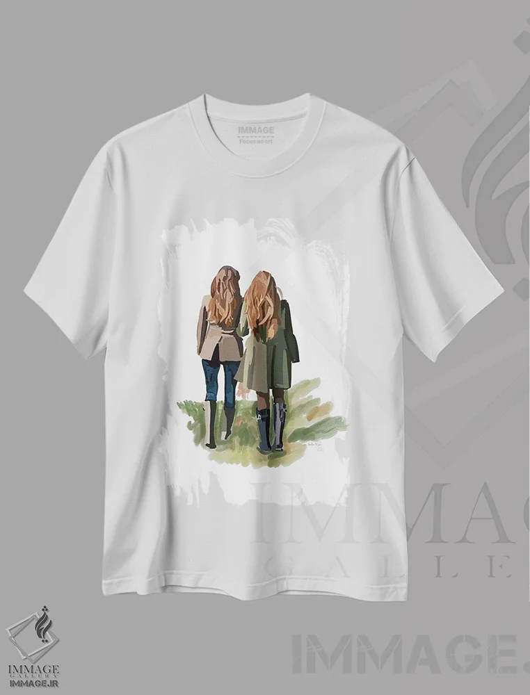 تیشرت سفید طرح دار دختران در حال قدم زدن، تزئینی اثر آملیا نویز | فروشگاه ایماژ تیشرت طرح دار دختران در حال قدم زدن اثر آملیا نویز