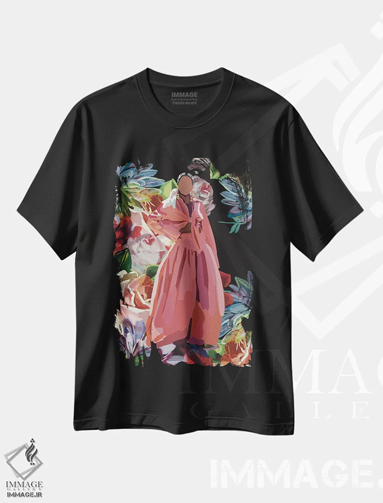 تیشرت مشکی طرح دار زنان با گل های صورتی، تزئینی اثر آملیا نویز | فروشگاه ایماژ تیشرت طرح دار زنان با گل های صورتی اثر آملیا نویز