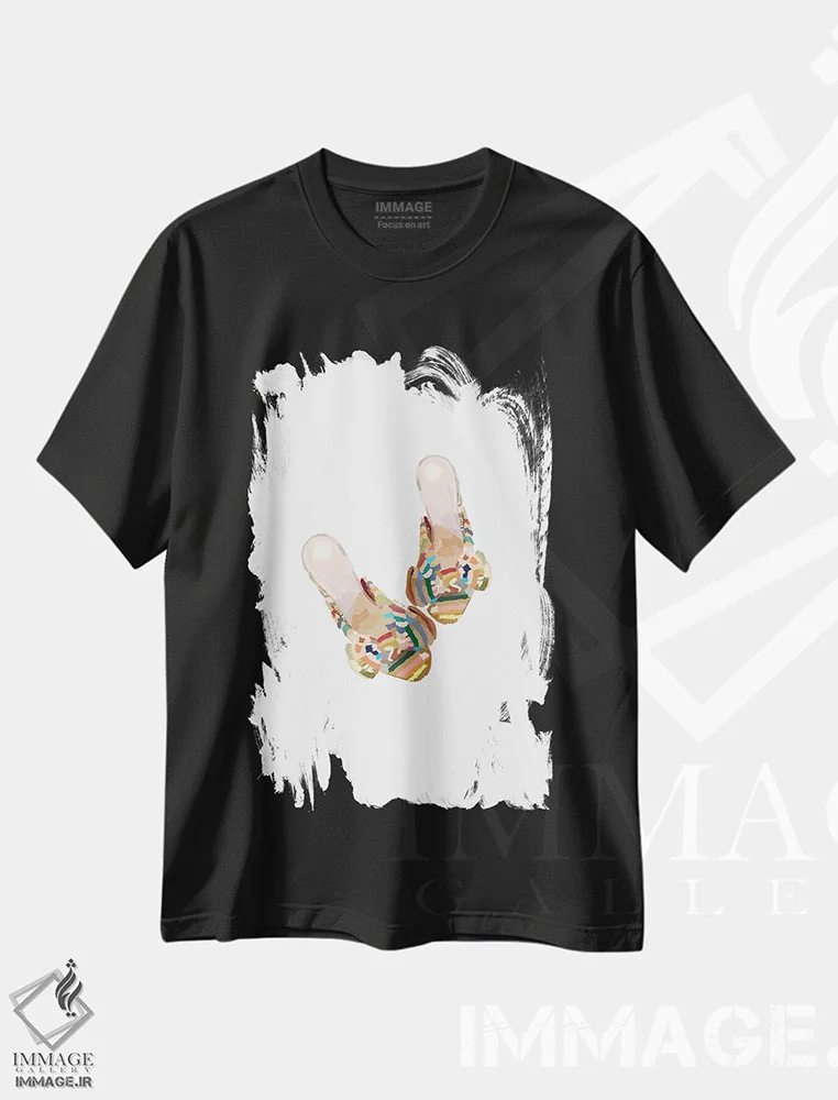 تیشرت مشکی طرح دار کفش های رنگین کمانی، تزئینی اثر آملیا نویز | فروشگاه ایماژ تیشرت طرح دار کفش های رنگین کمانی اثر آملیا نویز