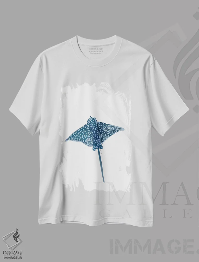 تیشرت سفید طرح دار سفره ماهی، تزئینی اثر آملیا نویز | فروشگاه ایماژ تیشرت طرح دار سفره ماهی اثر آملیا نویز