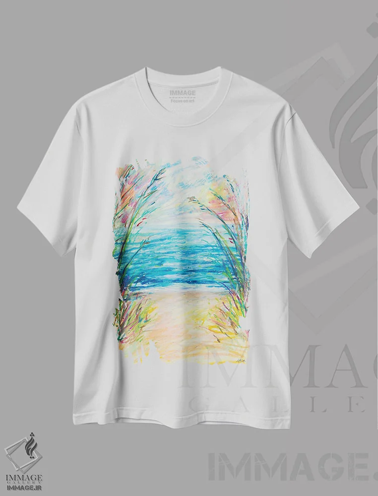 تیشرت سفید طرح دار مسیر به سوی آب، دکور ساحلی اثر آن مری کولیک | فروشگاه ایماژ تیشرت طرح دار مسیر به سوی آب اثر آن مری کولیک