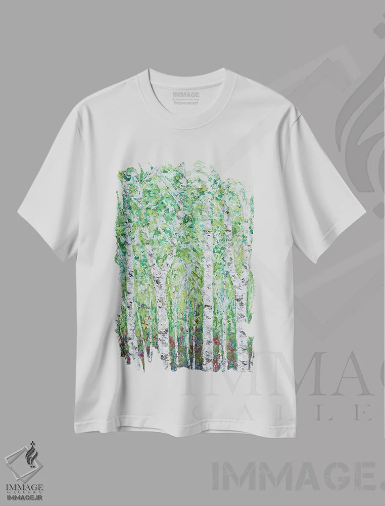 تیشرت سفید طرح دار چوب غان سبز II، مدیوم اثر آن مری کولیک | فروشگاه ایماژ تیشرت طرح دار چوب غان سبز II اثر آن مری کولیک