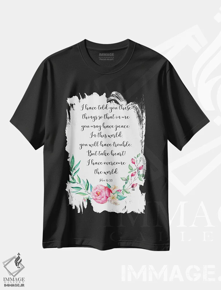 تیشرت مشکی طرح دار آثار ادن پرینتیبلز - immage.ir تیشرت طرح دار در این جهان رنج خواهید کشید؛ اما دل قوی دارید! من بر جهان غلبه کرده ام، یوحنا :اثر ادن پرینتیبلز