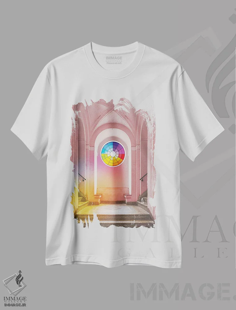 تیشرت سفید طرح دار پنجره چرخ رنگ، عکاسی ترکیبی اثر ارین سامر | فروشگاه ایماژ تیشرت طرح دار پنجره چرخ رنگ اثر ارین سامر