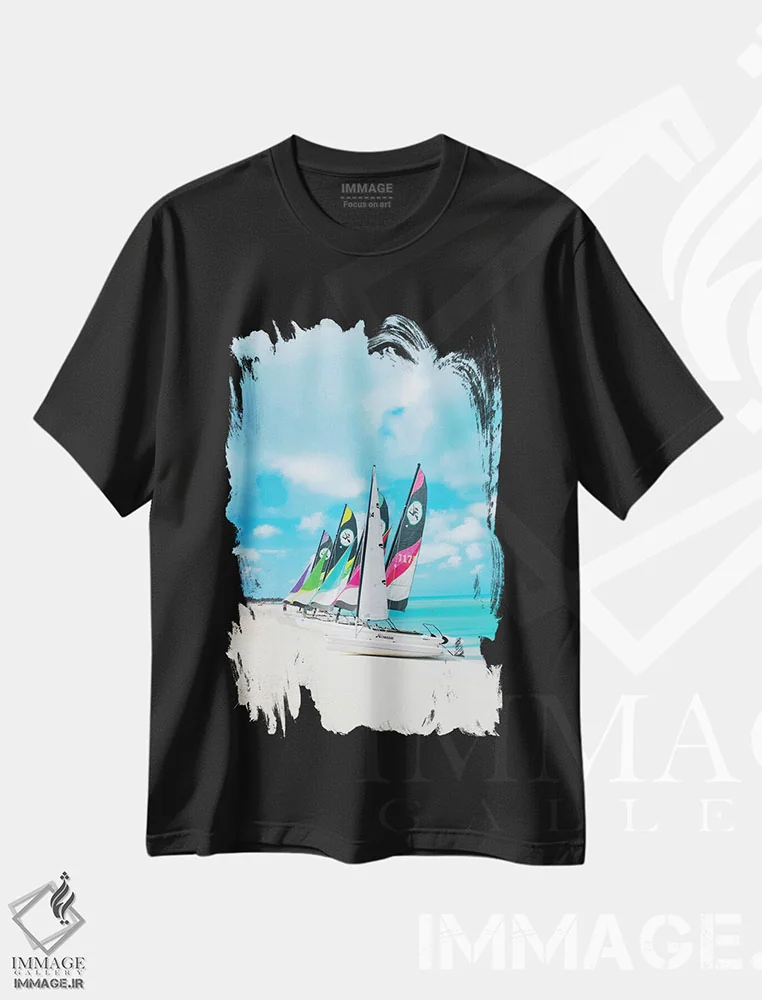 تیشرت مشکی طرح دار قایق های رنگارنگ، دکور ساحلی اثر ارین سامر | فروشگاه ایماژ تیشرت طرح دار قایق های رنگارنگ اثر ارین سامر
