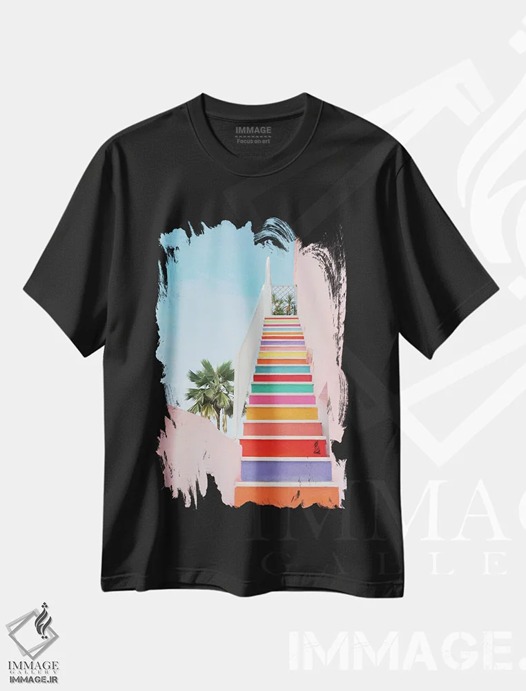 تیشرت مشکی طرح دار پله های رنگین کمانی، تزئینی اثر ارین سامر | فروشگاه ایماژ تیشرت طرح دار پله های رنگین کمانی اثر ارین سامر
