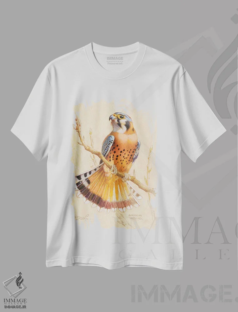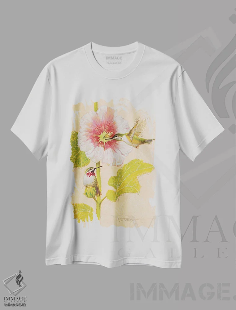 تیشرت سفید طرح دار مرغ مگس خوار گلوی یاقوتی و ملکه پروانه ها، تزئینی اثر ازرا تاکر | فروشگاه ایماژ تیشرت طرح دار مرغ مگس خوار گلوی یاقوتی و ملکه پروانه ها اثر ازرا تاکر